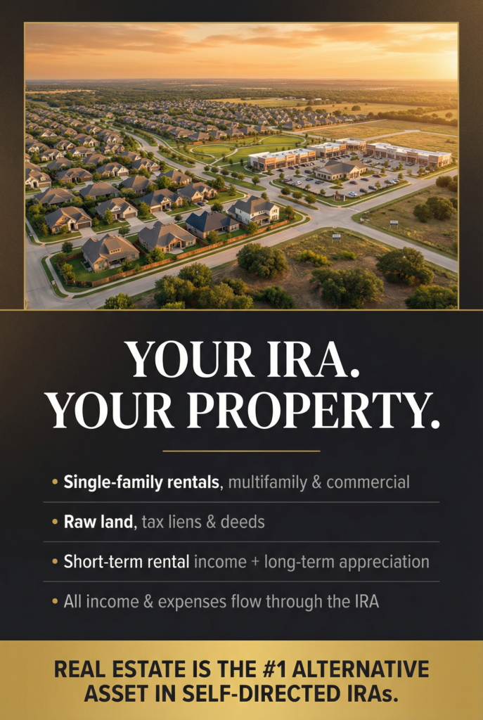 Real estate is one of the most popular alternative assets held in SDIRAs—and for good reason. Whether you’re interested in single-family rentals, multifamily properties, commercial buildings, raw land, or even tax liens and deeds, your real estate IRA can own them outright or partner with other investors.