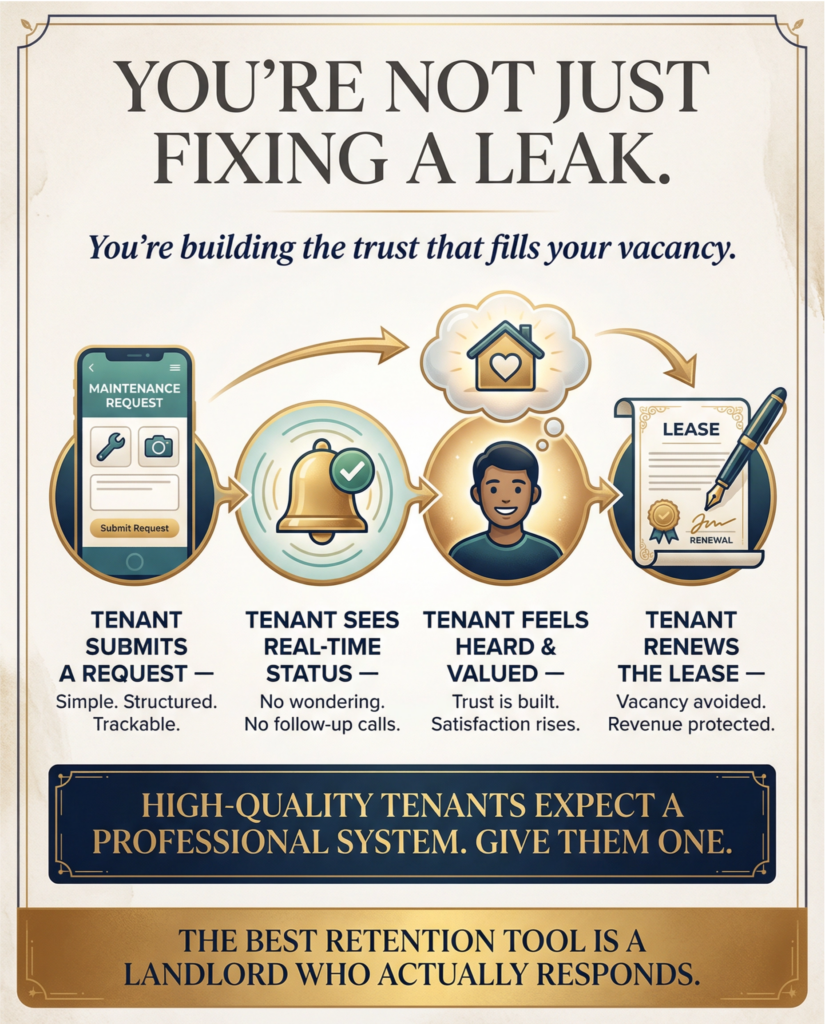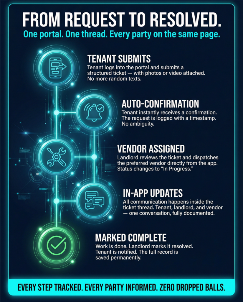 •A Tenant-Facing Portal: Your tenants get access to a simple web portal or mobile app where they can formally submit a maintenance request. This replaces the random text message with a structured, trackable ticket.