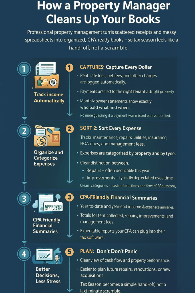 Tax season can feel overwhelming for Texas landlords. Between gathering receipts, tracking rental income, and categorizing expenses, it’s easy for important details to slip through the cracks. Professional property managers, however, make this process much simpler, helping landlords keep clean, organized books that are ready for the CPA and compliant with IRS guidelines.