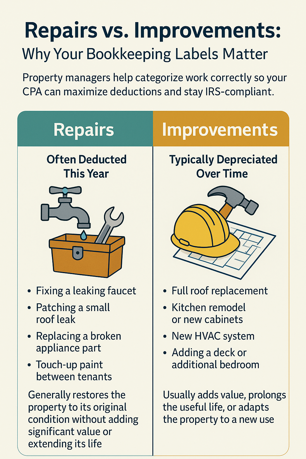 Property managers also track expenses, from routine maintenance and emergency repairs to utilities, insurance premiums, HOA dues, and management fees. Proper categorization is crucial—especially when distinguishing between repairs (which can often be deducted immediately) and improvements (which may need to be depreciated over time).