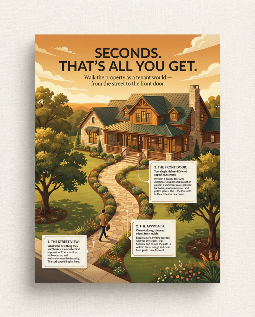 Before you list your property or begin showing it, you must perform one last walkthrough. This time, however, you are not looking for system failures; you are looking at the property through the eyes of a prospective tenant. Start at the street and walk toward the front door. What do you see? This first impression is formed in seconds and is incredibly difficult to change. Your goal is to make every detail project an image of a well-cared-for, desirable home.