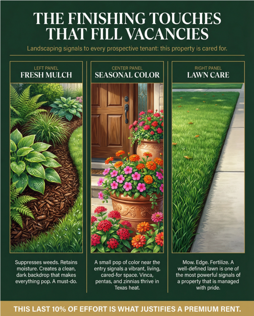 •Seasonal Color: Plant a few flats of heat-tolerant annuals (like vinca, pentas, or zinnias in Texas) near the entryway or in pots on the porch. A small pop of color signals a vibrant, living space.