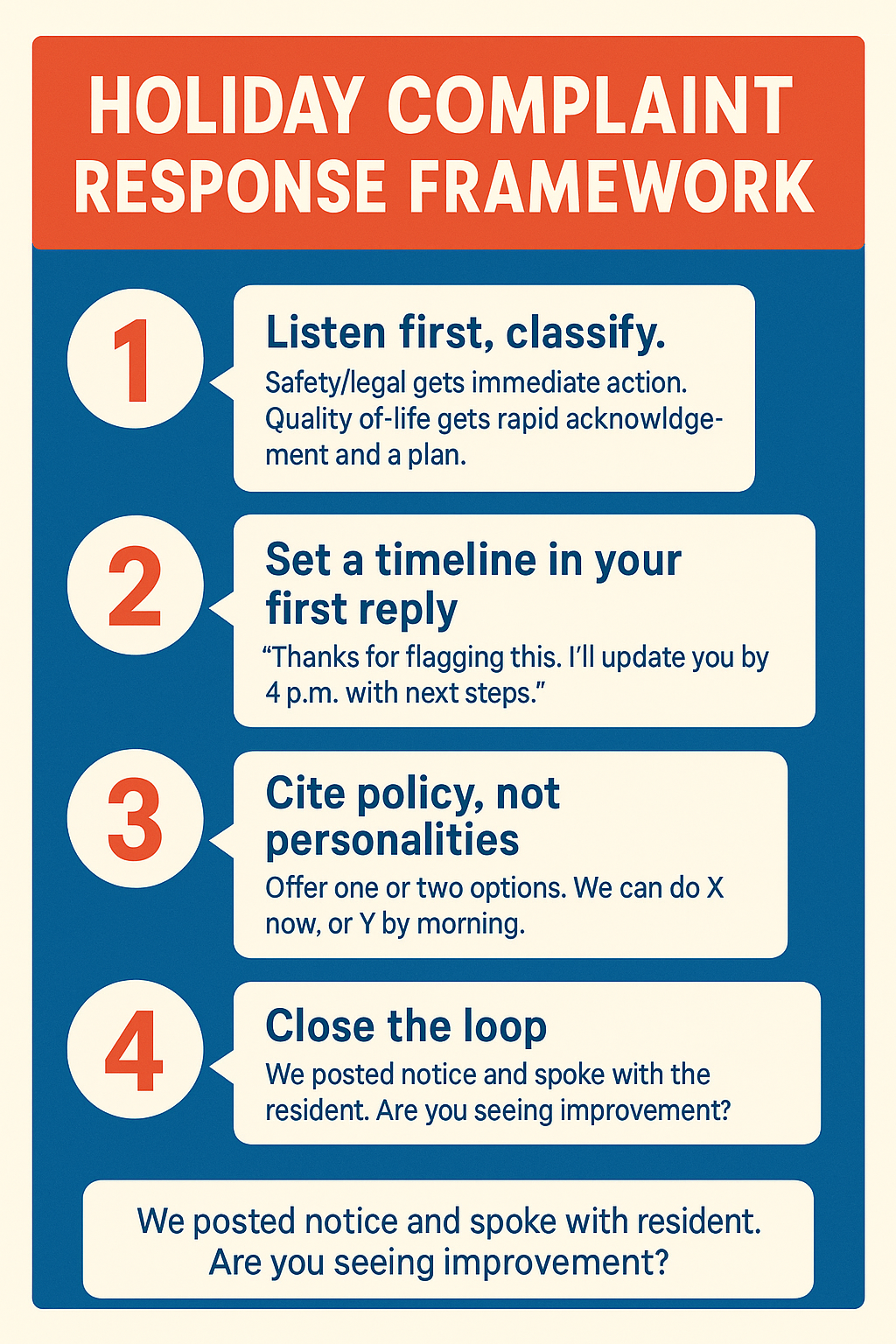 1) Listen first, classify. Safety/legal (gas smell, threats, fire hazards) gets immediate action. Quality-of-life (noise, odors, parking) gets rapid acknowledgement and a plan.