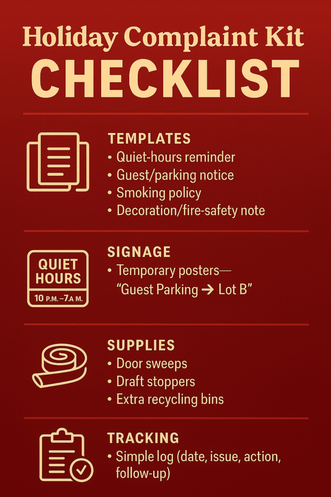 The holidays magnify everything—joy, stress, and yes, complaints. More guests, tighter parking, louder nights, and shorter tempers make December a hotspot. Your job isn’t to promise perfection; it’s to respond quickly, apply the lease consistently, and keep the building calm. Here’s a streamlined, people-first playbook.