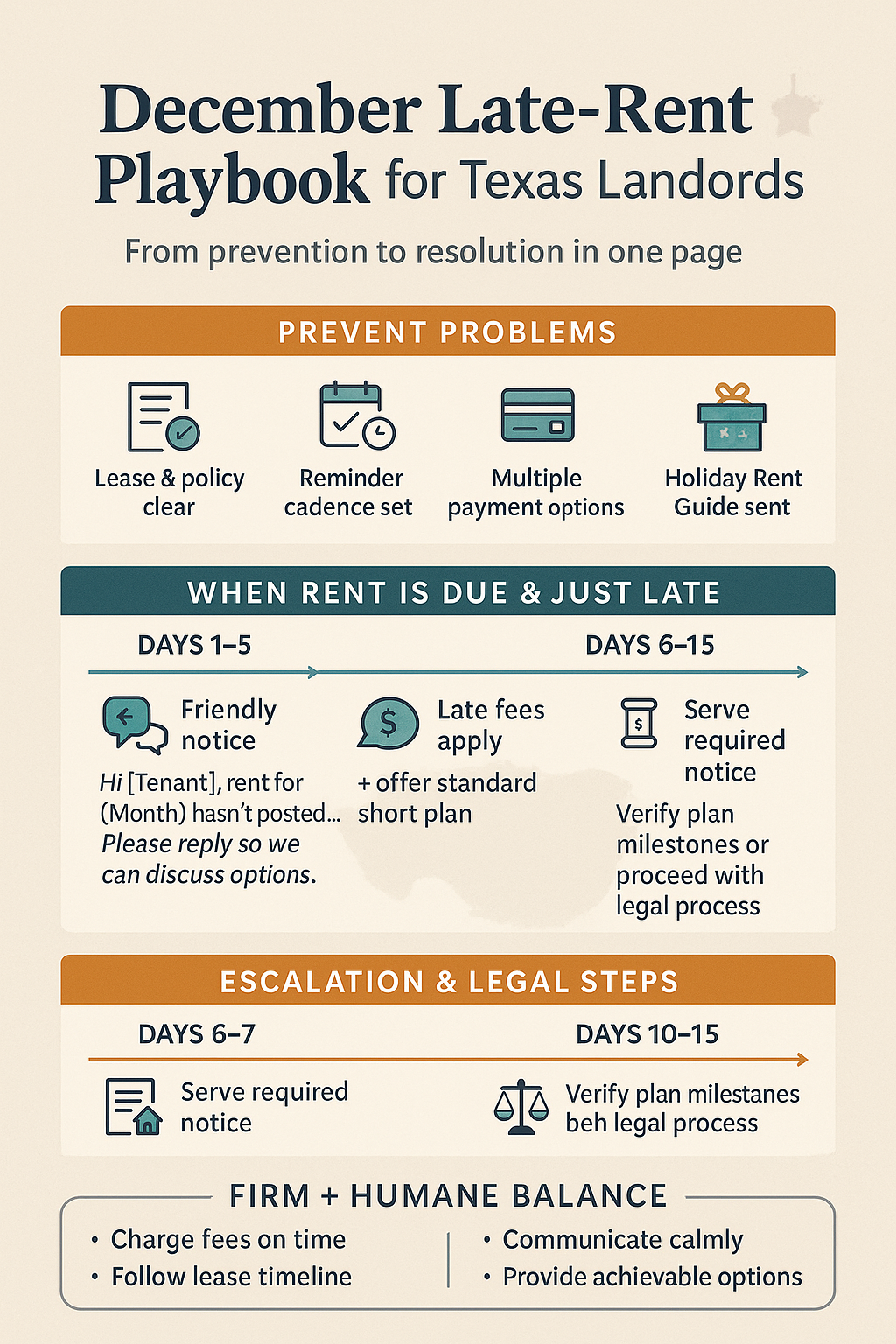 “Hi [Name], rent for [Month] hasn’t posted. Holidays and bank closures can cause delays. When can you pay? If you’ll be past [date], we can discuss a short plan. I can email the options.”