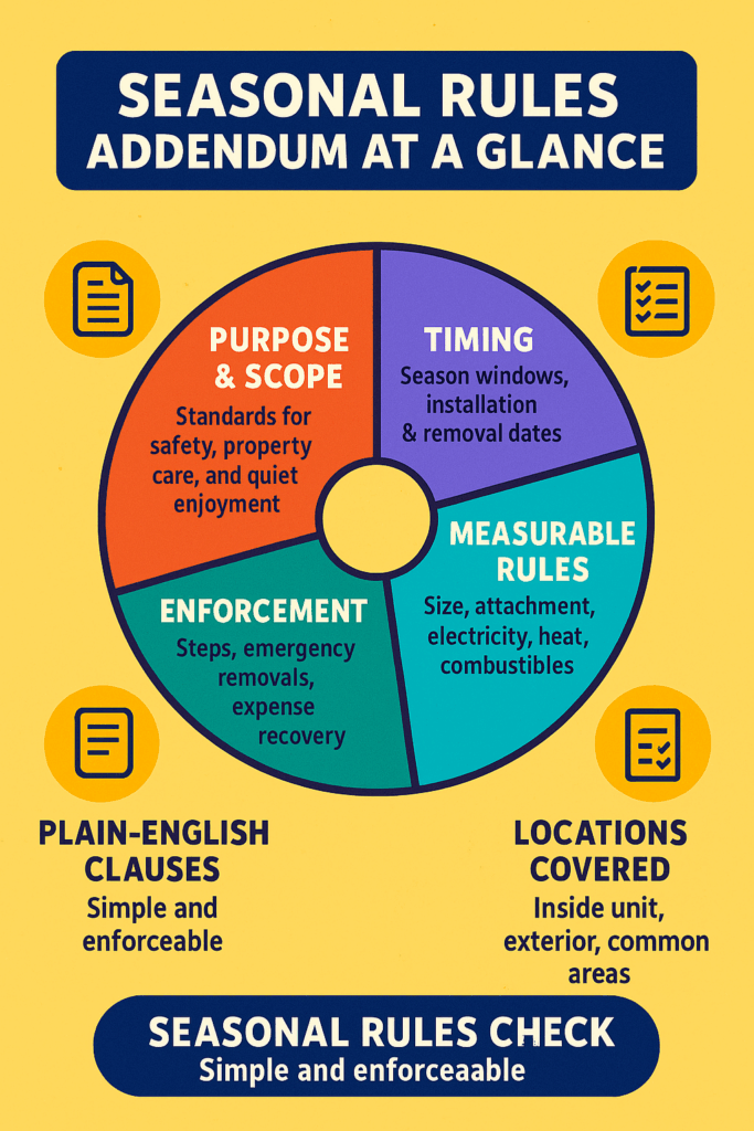 A tight, neutral addendum turns seasonal chaos into a routine. You’ll protect life safety and property condition, keep enforcement fair, and give residents clear guardrails for celebrating the season.