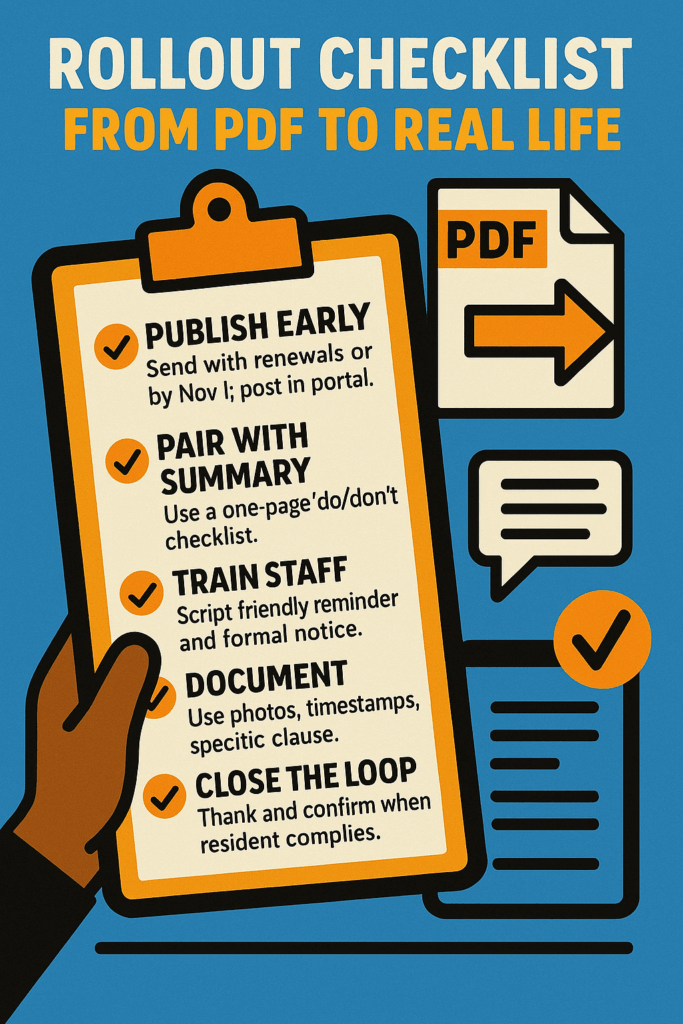 Seasonal issues are predictable: décor creeping into hallways, space heaters tripping breakers, windy balconies turning planters into projectiles. The clean way to manage all of it is a short, plain-English Seasonal Rules Addendum attached to the lease—neutral in tone, specific enough to enforce, and easy for residents to follow.