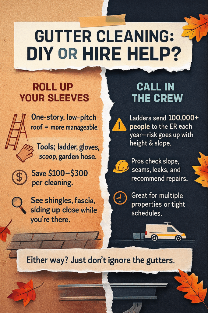 In our earlier piece, Maintenance Matters: Fall Roof & Gutter Checklist Before Winter Hits, we talked about the importance of inspecting gutters before cold snaps and heavy rains. Now let’s take a closer look at the practical side of the job: should you roll up your sleeves and clean them yourself, or hire a professional?