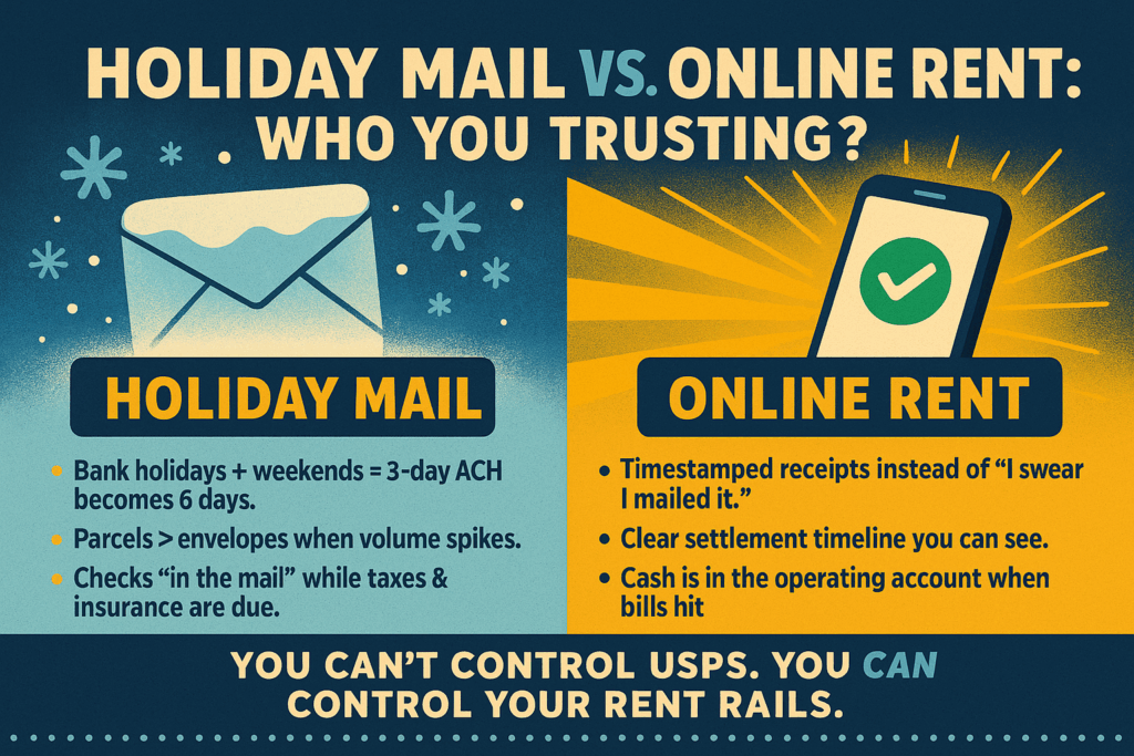 If you’ve managed rentals for more than a season, you’ve lived the holiday timing dance: checks that “went out Friday,” envelopes that sit in a sorting center, bank holidays stacked next to weekends, and tenants who swear the mailman is personally plotting against their ledger. You can’t fix USPS routing or bank calendars—but you can design a rent collection system that doesn’t depend on the mailbox at all.