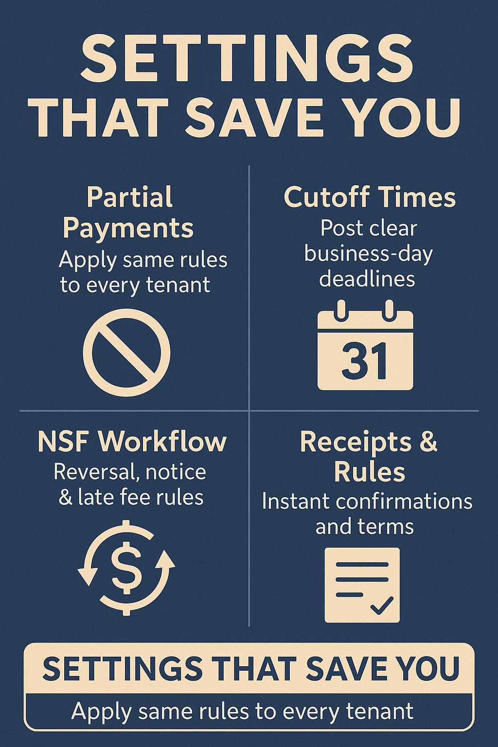 - Enable with rules for normal months (example: allow partials only after base rent is satisfied or with an approved payment plan). Consistency is key—apply the same rule to everyone.
