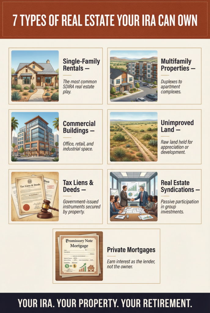 A self-directed IRA can hold a wide range of real estate investments, including: