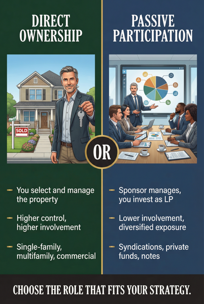 Some choose to invest in real estate indirectly through syndications or private funds. In these cases, a sponsor manages the property while investors participate as limited partners.