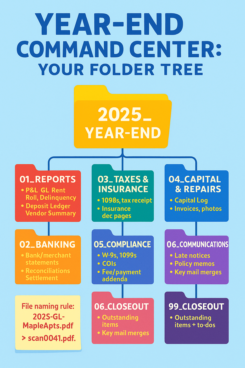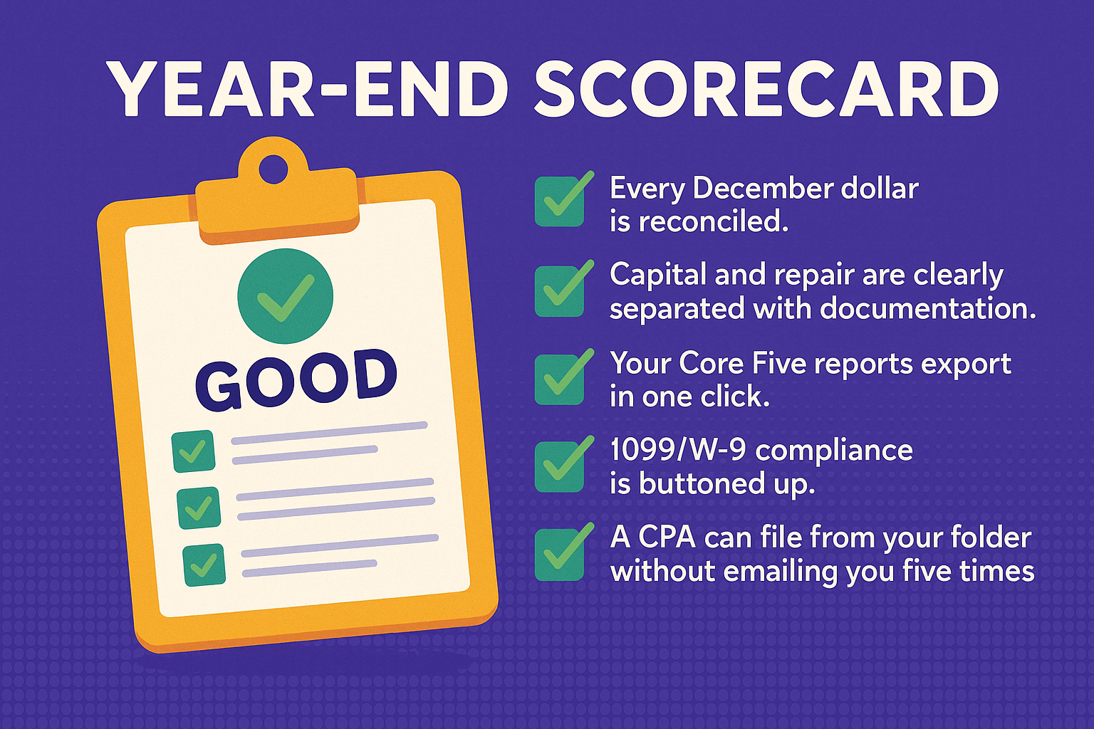 Year-end isn’t about heroics; it’s about structure. Build a predictable folder tree, reconcile December, separate capital from repair, save the high-impact docs, and lock down W-9/1099 compliance. Do that, and handing your CPA a clean digital packet becomes easy—and next December will start from organized, not from scratch.