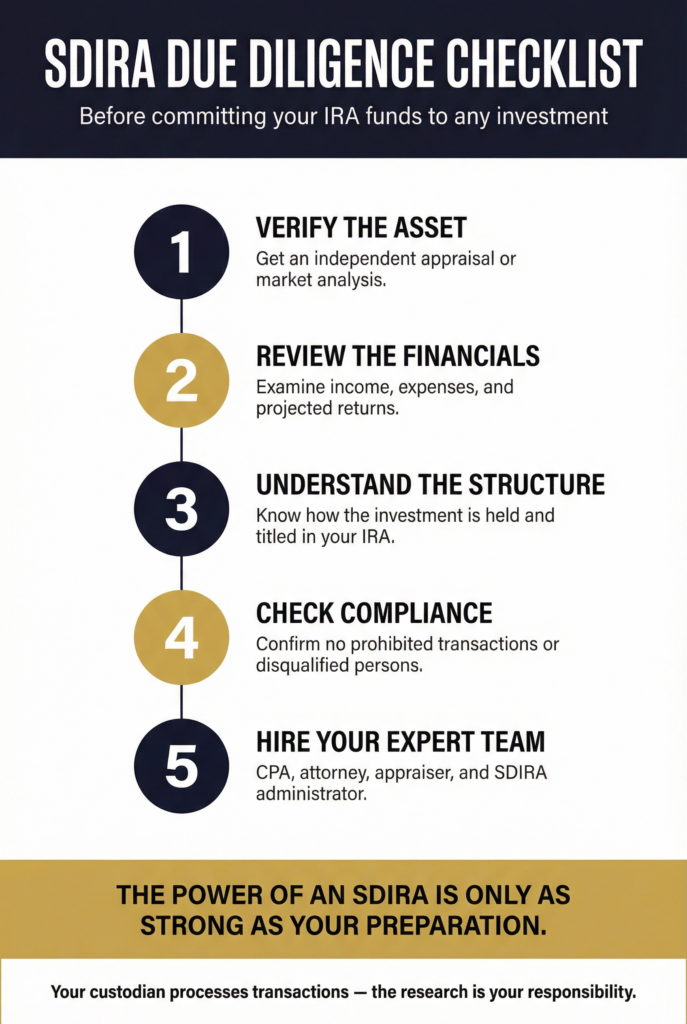 Due diligence means thoroughly vetting an investment before your IRA funds are committed. That means verifying property values, checking business financials, understanding the terms of a private loan, and asking tough questions about risk and reward.